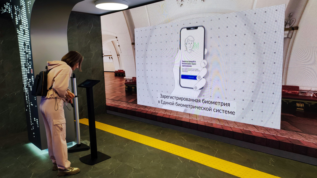 На снимке посетительница наклоняется к сенсорному устройству возле большого цифрового экрана, где демонстрируется анимация о регистрации биометрии в Единой биометрической системе. Экран оформлен в стилистике общественного транспорта, а рядом видны элементы современного интерьерного дизайна стенда, включая подсветку и тактильную разметку. Фото подходит для статей о цифровой идентификации, интерактивных технологиях и современных выставочных решениях.