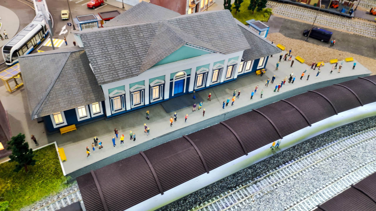 Макет городского вокзала с пассажирами и железнодорожными платформами