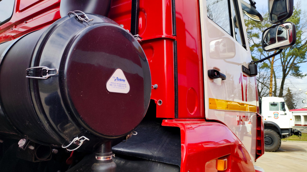 На изображении представлен крупный план воздушного фильтра пожарного автомобиля, участвовавшего в выставке «МЧС России. Технологии спасения» на ВДНХ в 2024 году. В кадр также попадает часть кабины с номером 17 и маркировкой «Мытищи». На фоне видны другие служебные автомобили, элементы выставочного павильона и деревья. Видны металлические крепления, корпус фильтра и детали облицовки. Кадр подчёркивает конструктивные особенности техники и может использоваться в материалах об обслуживании пожарных машин и демонстрации их технических элементов.