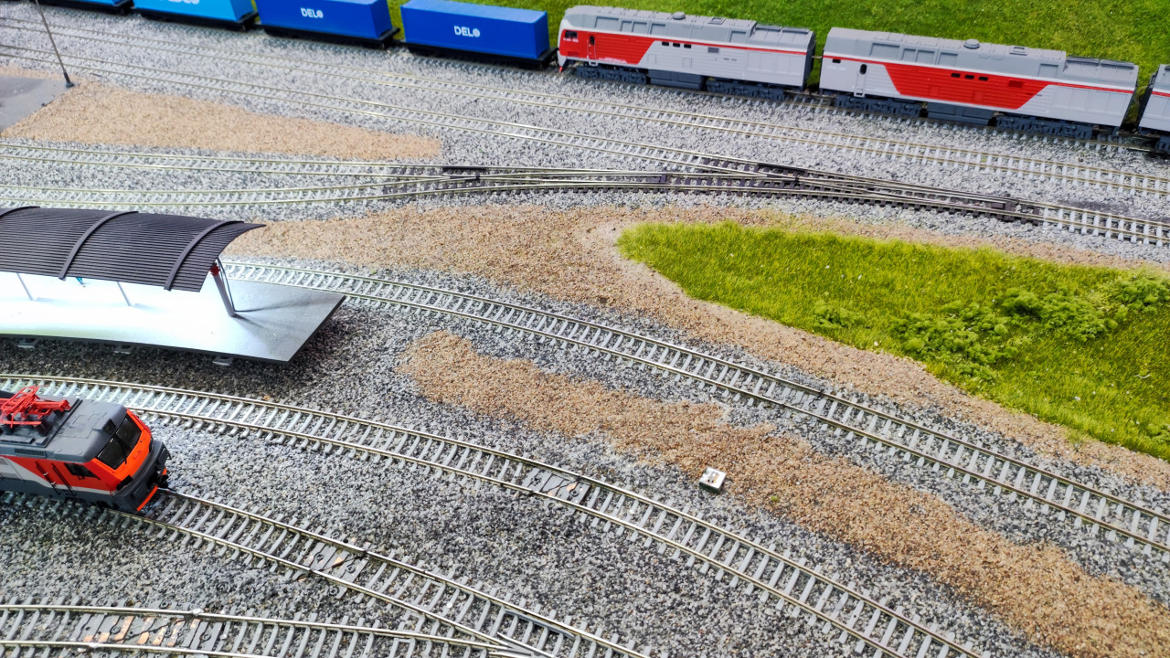 На фотографии изображён фрагмент масштабного макета транспортной инфраструктуры, представленного в павильоне №15 ВДНХ на выставке «Россия». На переднем плане видны изогнутые железнодорожные пути с гравийной засыпкой, по которым движется модель электровоза. В верхней части кадра размещены контейнерные платформы с моделями грузовых вагонов. Справа расположена зона с зелёным рельефом. Фрагмент демонстрирует организацию железнодорожного узла и используется в экспозиции для наглядного показа работы транспортной системы.