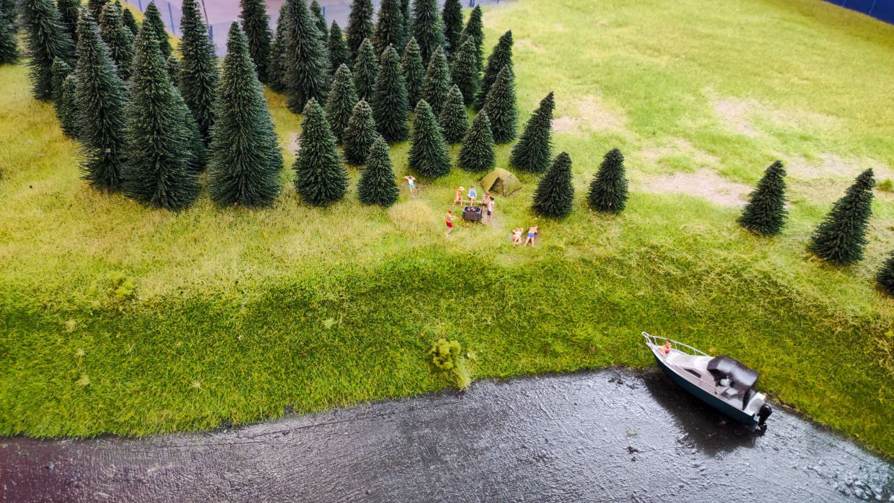 Макет лесной стоянки с палаткой и отдыхающими возле водоёма