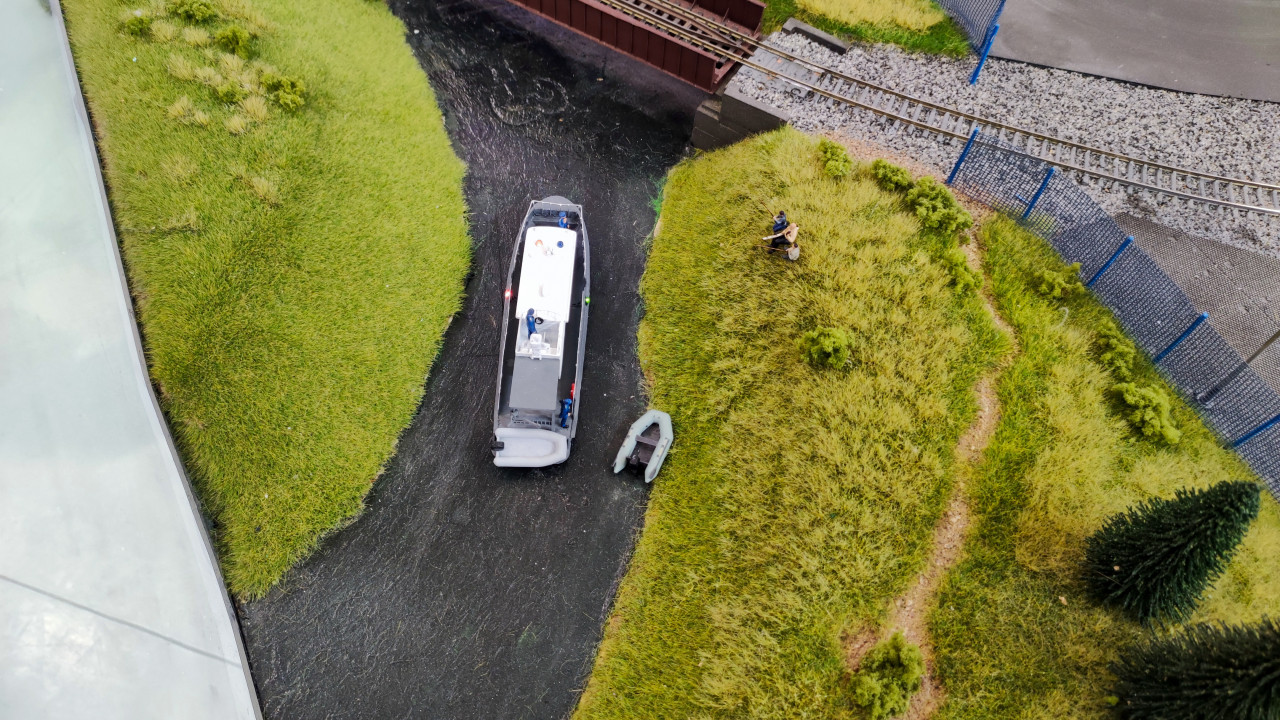 На фотографии показан фрагмент макета из экспозиции «Россия» в павильоне №15 ВДНХ. В центре изображена модель моторной лодки, находящейся на узком водном русле. Рядом у берега лежит надувная лодка. Справа вдоль склона тянется тропа, ведущая мимо кустарников и травяных участков. В верхней части кадра заметен железнодорожный мост с фрагментом рельсового полотна и гравийной засыпкой. Макет демонстрирует сочетание природного ландшафта и элементов транспортной инфраструктуры и может использоваться в материалах о моделировании, выставочных проектах и визуализации транспортных систем.