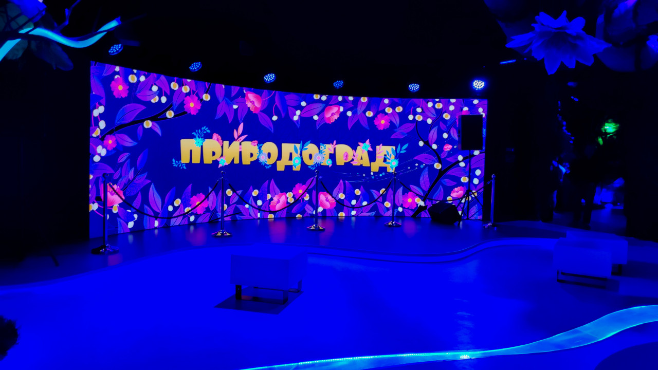 На фотографии показана часть павильона выставки-форума «Россия» на ВДНХ с большим изогнутым LED-экраном, на котором отображено название «Природоград», оформленное в яркой графической стилистике с использованием цветочных и растительных элементов. Перед экраном размещены стойки с канатными ограждениями, предназначенными для организации зрительской зоны. Пол освещён насыщенными синими оттенками, повторяющими дизайн остальной части тематического павильона. Снимок отражает атмосферу интерактивного пространства, посвящённого природным темам, и может быть применён в материалах о выставочных технологиях, цифровых экспозициях и оформлении тематических залов.