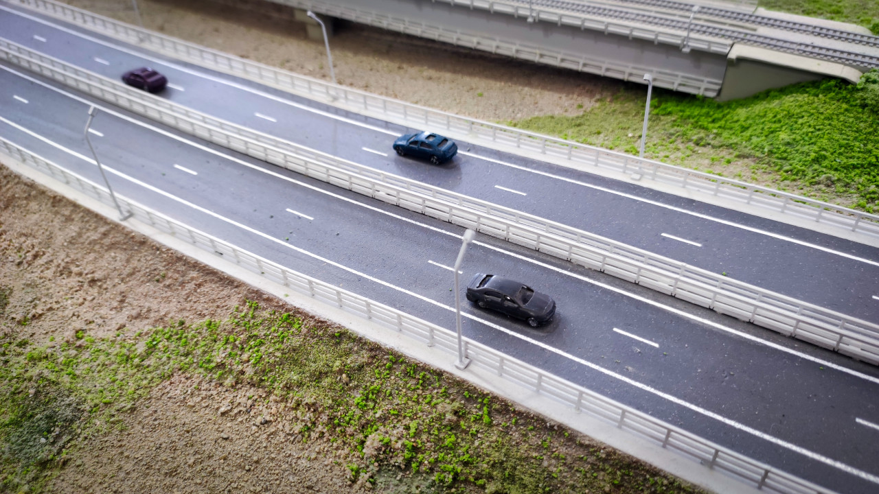 Фрагмент масштабной модели автомагистрали с миниатюрными автомобилями
