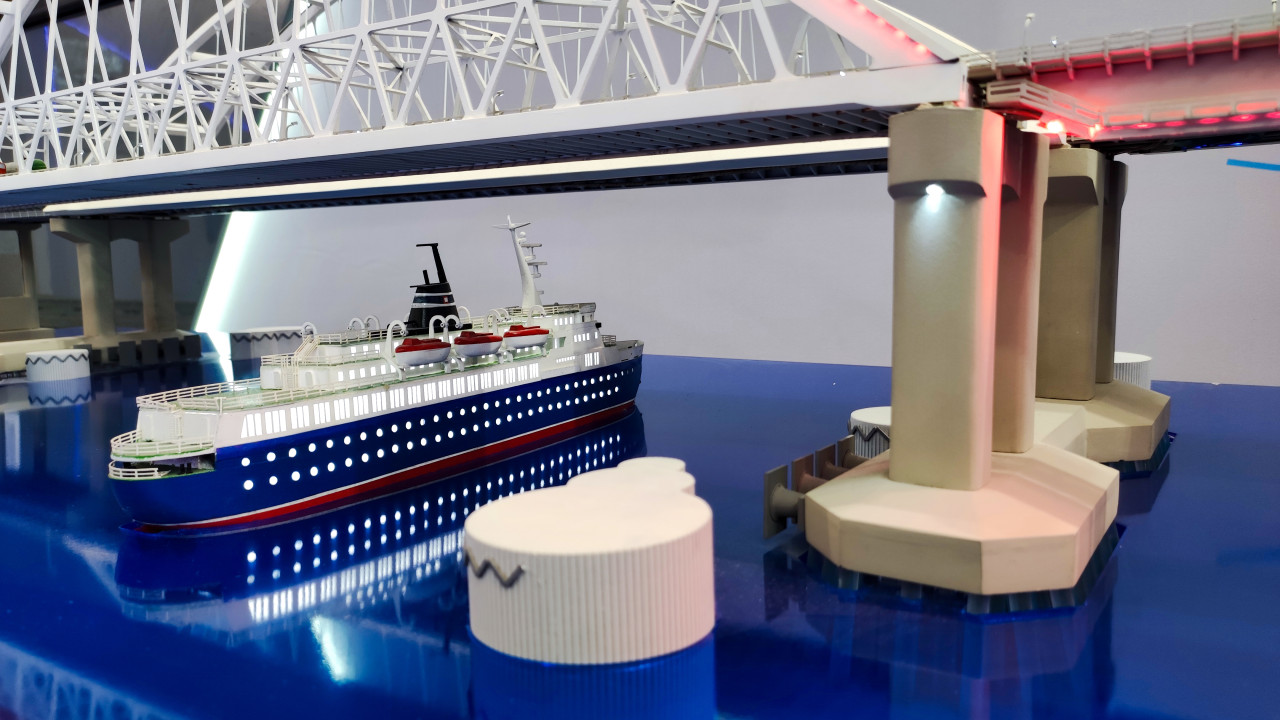 Макет судна под арочным пролётом транспортного перехода через Керченский пролив