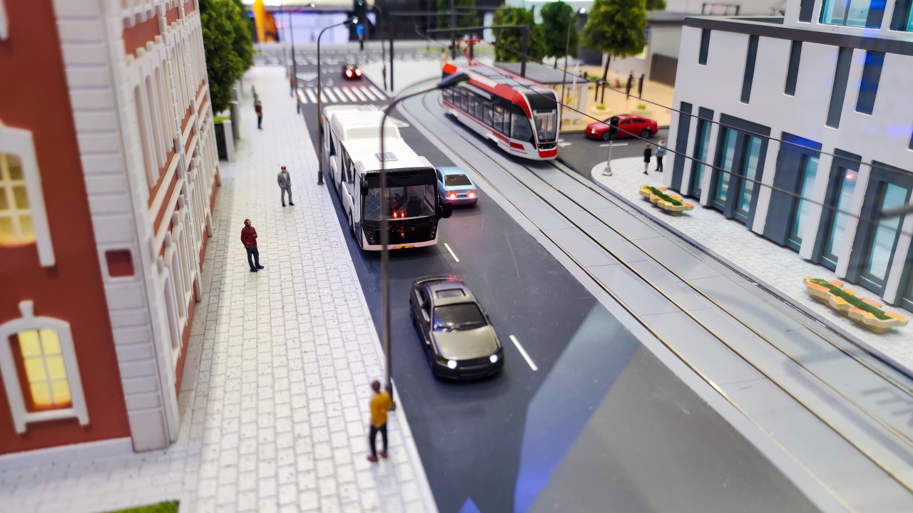 Фотография фиксирует участок детализированного макета городской транспортной системы, представленного в рамках экспозиции «Транспорт России» 2023–2024 годов. В центре видны модели автобуса, легкового автомобиля и трамвая, движущегося по трамвайным путям вдоль современной застройки. Пешеходы, уличное освещение и элементы благоустройства помогают передать структуру городского пространства. Изображение подходит для материалов о транспортном моделировании, выставочных проектах и современных подходах к организации передвижения в городе.