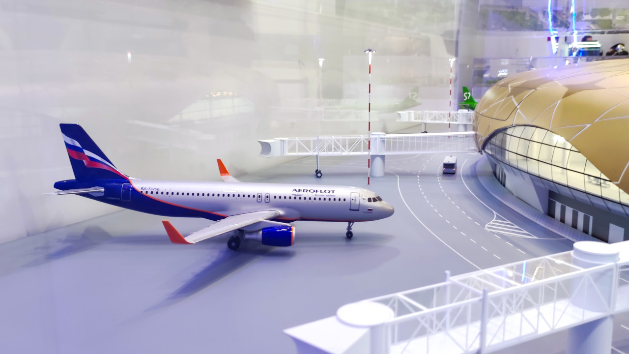 Макет авиалайнера «Аэрофлот» на модели аэродрома внутри павильона ВДНХ
