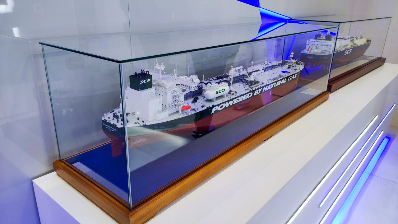 На снимке представлена часть экспозиции морского транспорта в павильоне №15 ВДНХ, где展示вались масштабные модели судов, работающих на природном газе. В витрине расположен детализированный макет газовоза под брендом SCF, с маркировкой «Powered by Natural Gas» и надписью ECO на борту. Судно отображено с характерными конструктивными элементами: надстройкой, грузовыми танками и трубой. На заднем плане виден второй аналогичный макет. Экспозиция была частью выставки «Россия», организованной Министерством транспорта РФ, и иллюстрировала развитие экологичных технологий в морской отрасли. Фотография подходит для публикаций о морском транспорте, логистике и судостроении.