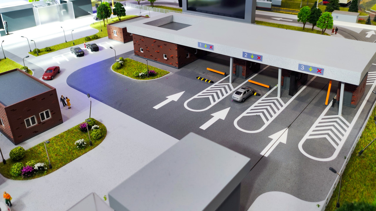На фотографии изображён макет пункта досмотра транспорта, включающий несколько полос движения, контрольные навесы, служебные здания и парковочные площадки. Модель демонстрирует работу портальных комплексов «Скантроник Систем» и «Диагностика-М», представленных на выставке «Россия» в павильоне №15 ВДНХ. Видны разметка, миниатюрные автомобили, озеленение и элементы контроля въезда. Павильон относится к историческому комплексу ВДНХ, созданному в середине XX века. Фото подходит для материалов о транспортной инфраструктуре, техническом контроле и моделировании.
