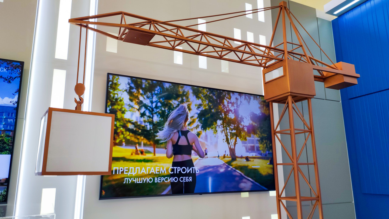 Фотография показывает макет башенного крана, установленный в павильоне №15 ВДНХ в рамках экспозиции «Строим будущее» на выставке «Россия» 2024 года. На фоне демонстрируется видеоконтент, посвящённый объектам городской инфраструктуры и современным строительным технологиям. Экспозиция позволяла посетителям в интерактивной форме узнавать о крупных проектах, введённых в эксплуатацию по всей стране. Снимок подходит для материалов о презентации строительных компаний, образовательных стендах и медиапространствах отрасли.