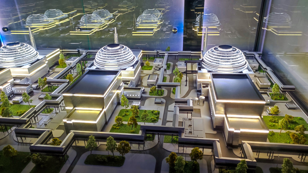 На фото запечатлён макет перспективной атомной станции в масштабе 1:200, демонстрируемый в павильоне «Атом» на ВДНХ. В кадре видны несколько одинаковых энергоблоков с купольными зданиями реакторных отделений, подсветкой контуров и сетью соединительных галерей. Макет иллюстрирует концепцию станции, эквивалентной четырём российским реакторам ВВЭР-1200 суммарной мощностью 4800 МВт, способной обеспечивать энергией до 10 миллионов человек. Он используется для наглядной демонстрации принципов современной атомной энергетики и перспектив развития отрасли.