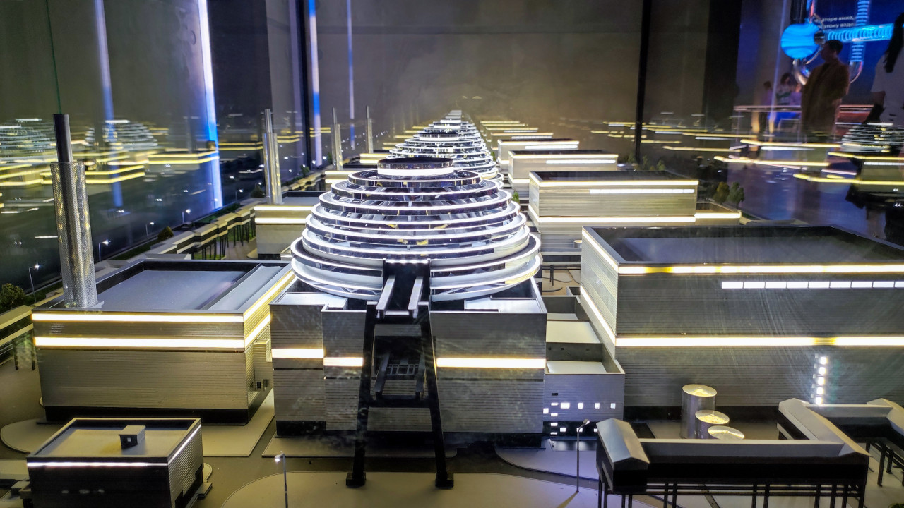 На изображении виден центральный энергоблок масштабного макета атомной станции мощностью 4800 МВт, представленного в павильоне «Атом» на ВДНХ. Купольная конструкция реакторного отделения выделяется подсветкой, вокруг размещены прямоугольные технологические здания, трубы, коммуникации и участки озеленения. Отражения на стеклянных стенах создают эффект протяжённого комплекса. Макет служит демонстрацией планировочных и конструктивных решений атомной энергетики нового поколения.