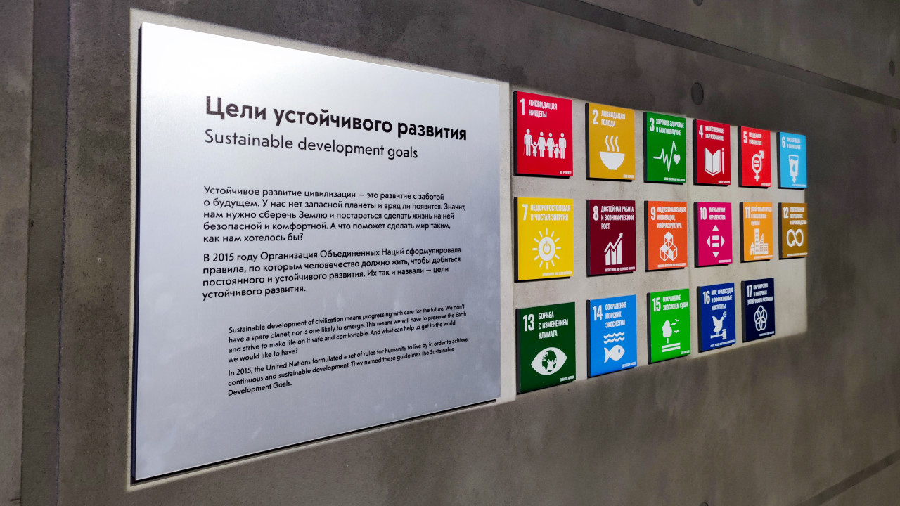 Стенд с целями устойчивого развития ООН в экспозиции павильона «Атом»