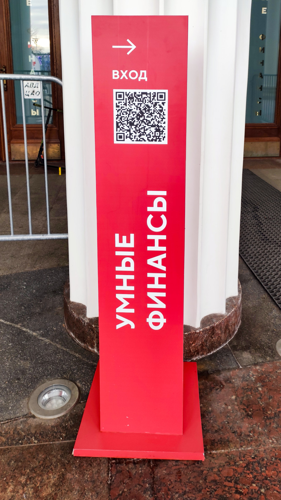 На снимке изображён вертикальный красный указатель входа на выставку «Умные финансы», установленный рядом с белыми колоннами павильона №71 ВДНХ. На конструкции нанесена стрелка направления, QR-код и название экспозиции. В кадр также попадают фрагменты каменного покрытия площадки, часть двери павильона и элементы ограждений. Сам павильон относится к архитектуре середины XX века и является частью культурного комплекса ВДНХ. Фотография может быть использована в публикациях о навигации на мероприятиях, образовательных проектах и инфраструктуре выставок.