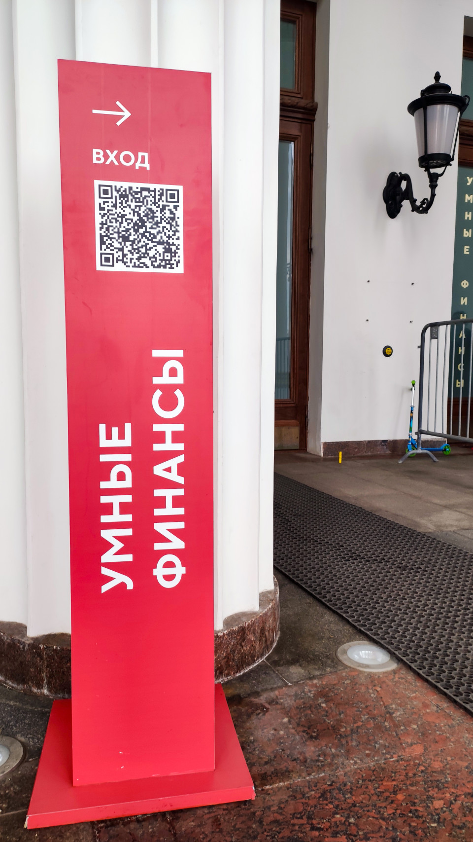 Указатель входа на выставку «Умные финансы» у колонн павильона №71 ВДНХ