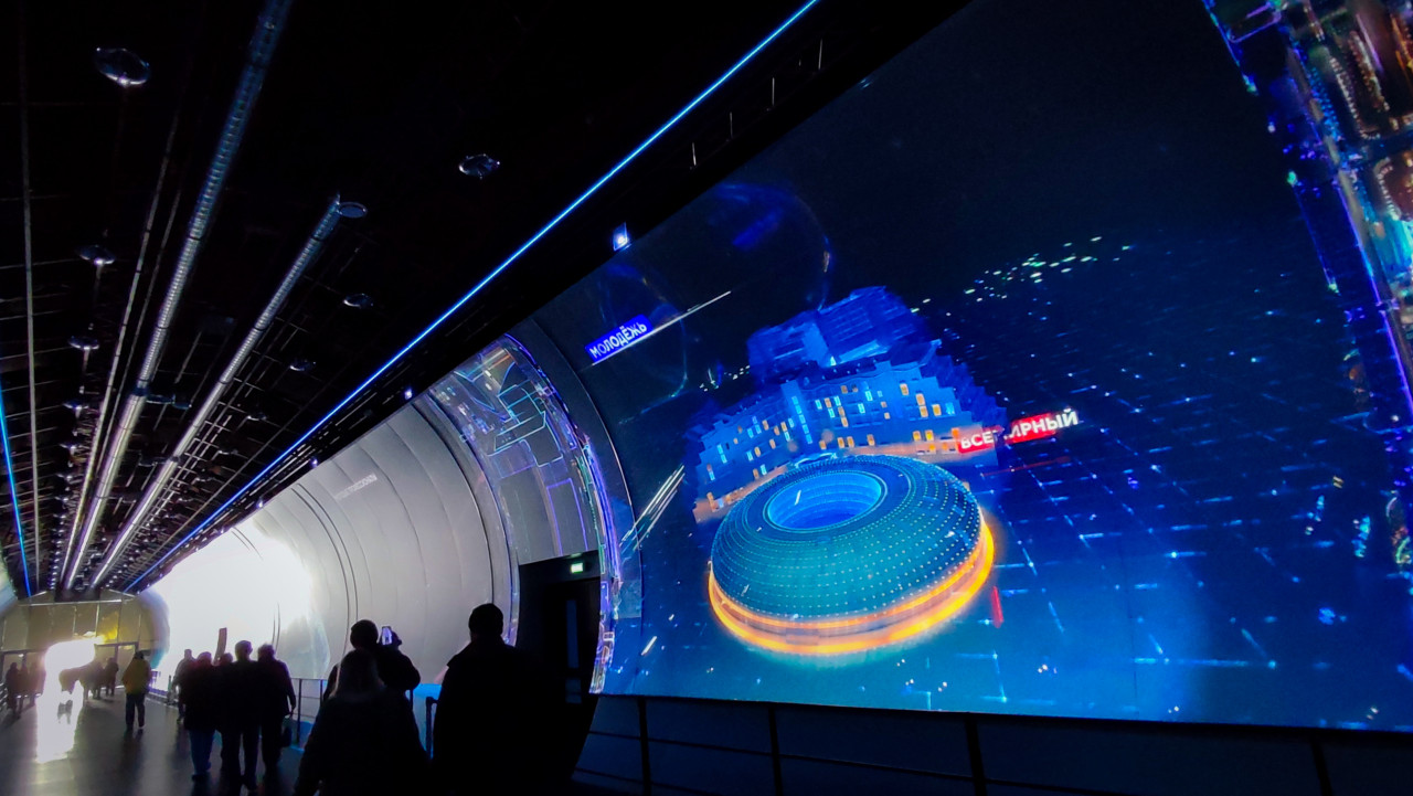 На снимке представлена часть мультимедийной стены в галерее «Достижения России» — павильоне А выставки-форума «Россия» 2023–2024 годов на ВДНХ. На экране отображён крупный цифровой объект, выполненный в виде светящейся круглой структуры, а также рядом расположенные здания. В проходе видны silhouettes посетителей, направляющихся к выходу. Панорамное пространство тоннеля длиной 166 метров использует цифровые экраны для демонстрации достижений страны. Фото подходит для материалов о цифровой архитектуре, современных выставках, медиаинсталляциях и визуальных технологиях.