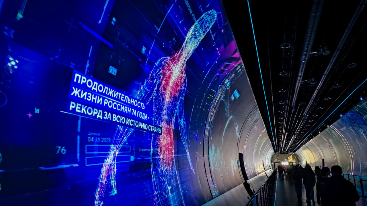 На фотографии представлен фрагмент мультимедийной стены внутри галереи «Достижения России» — павильона А выставки-форума «Россия» 2023–2024 годов на ВДНХ. На экране отображён контур человеческой фигуры, созданный с использованием световых линий, а также текст о рекордной продолжительности жизни россиян. Видна изогнутая форма тоннеля и silhouettes посетителей, движущихся вдоль экспозиции. Панорамные медиаэкраны павильона длиной 166 метров демонстрируют достижения страны в различных сферах. Фото подходит для материалов о медицине, цифровых технологиях, интерактивных выставках и социальных программах.