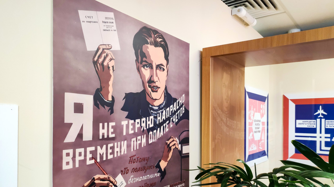 На изображении запечатлён крупный фрагмент советского агитационного плаката, размещённого в зоне экспозиции «Умные финансы» на выставке «Россия» в павильоне №71 ВДНХ. Плакат выполнен в характерной манере графики середины XX века и содержит призыв экономить время при оплате счетов. Справа видна деревянная конструкция стойки обслуживания, за которой располагаются дополнительные элементы интерьера тематической реконструкции, включая информационные стенды. На переднем плане заметны листья комнатного растения. Снимок подходит для материалов об истории финансовых услуг, визуальной культуре СССР и музейных экспозициях.