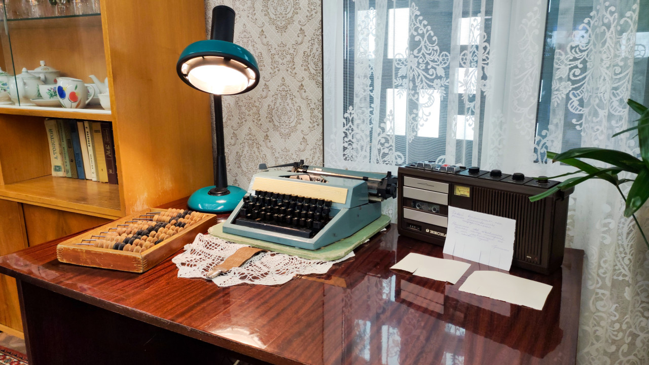 Рабочий стол с абаком, пишущей машинкой и радиоприёмником в зоне «Прошлое» выставки «Умные финансы»