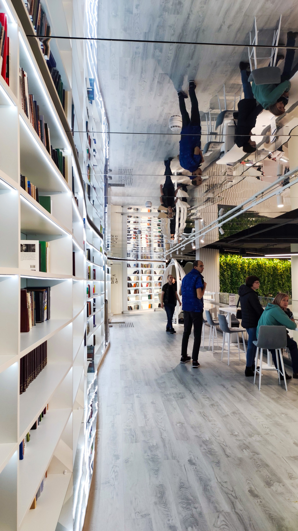 библиотека стеллажи книги зеркальный потолок вднх выставка россия интерьер современный стиль освещение культурное пространство общественная зона экспозиция выставка Россия ВДНХ посетители пространство дизайн архитектура барные стулья оптический эффект зелёная стена культурный проект интерьерное решение форум прогулка образовательная зонаПохожие фотографии