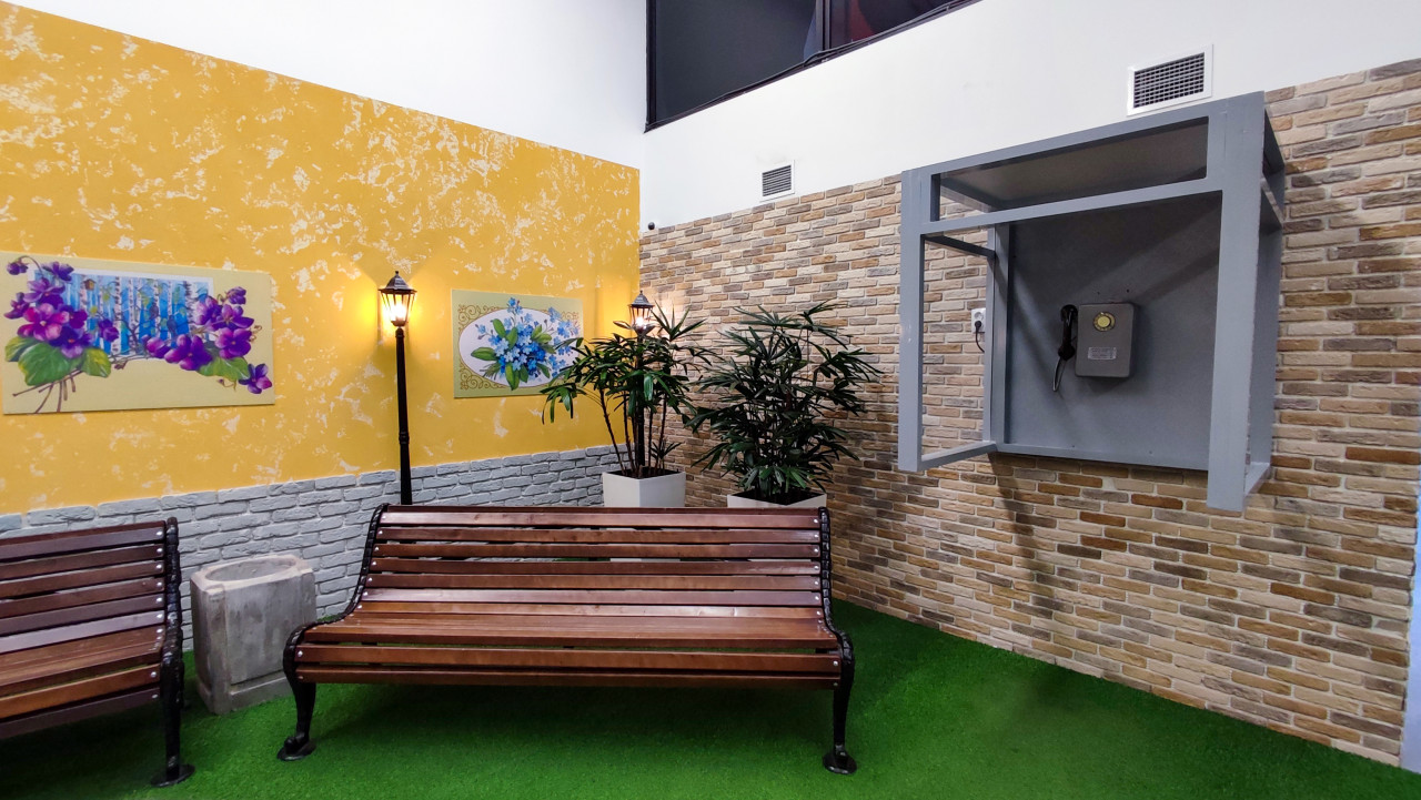 Фотография показывает декоративную зону экспозиции «Умные финансы» Банка России на выставке-форуме «Россия» (ВДНХ, 2023–2024), стилизованную под городское пространство. В кадре — две деревянные лавочки, фонари, декоративные растения, жёлтая и кирпичная стены, а также телефонная будка с ретро-телефоном. Пространство имитирует атмосферу советского двора или улицы, где демонстрировались бытовые элементы эпохи доцифровых коммуникаций. Снимок подходит для материалов о городской среде прошлого, музейных инсталляциях и ретро-культурных проектах.