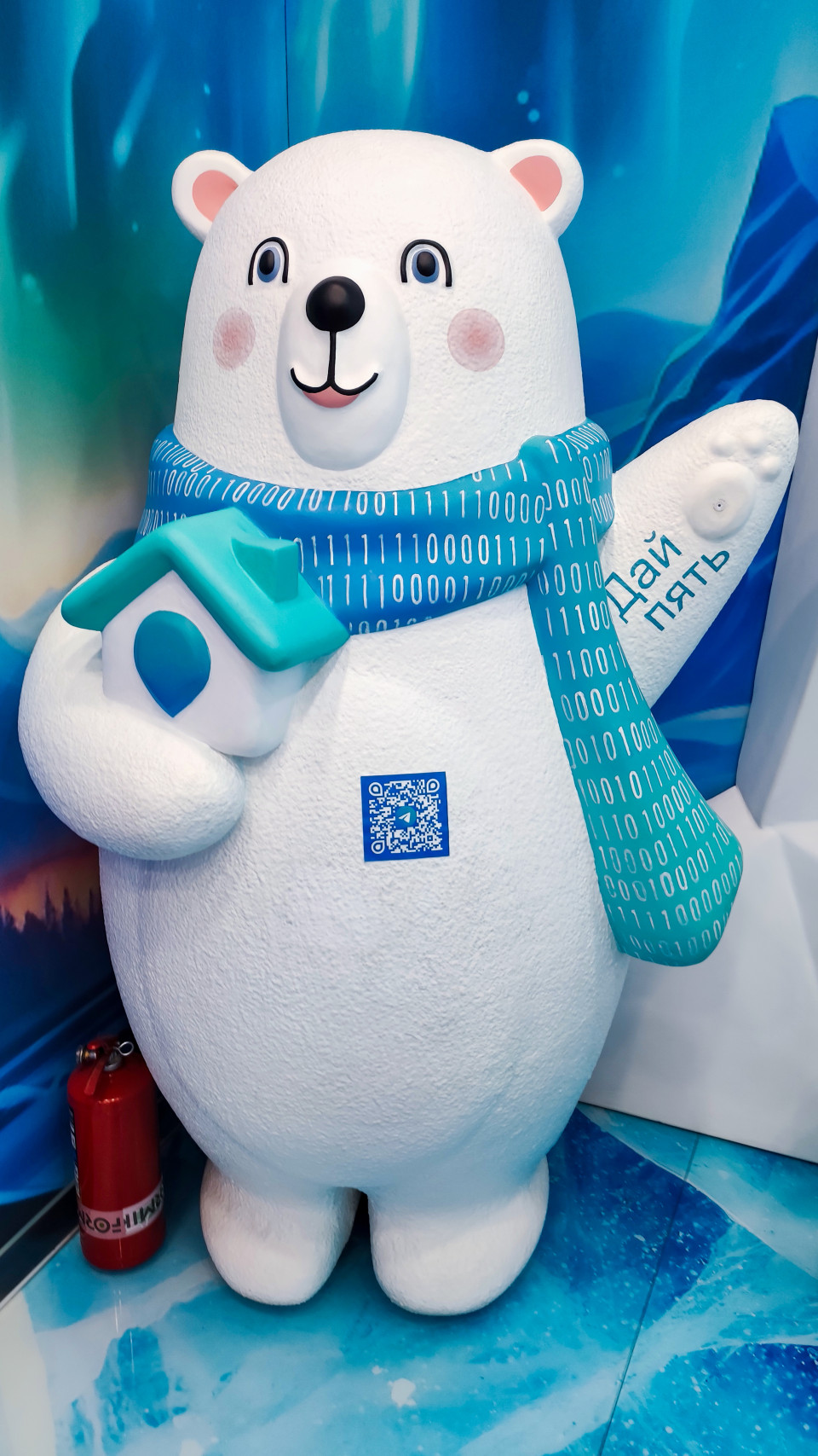На фотографии изображён белый медведь — часть брендированной инсталляции Росреестра на выставке «Россия» в павильоне ВДНХ. Он держит стилизованный домик, на шарфе и левом крыле-лапе размещены элементы фирменного дизайна с двоичным кодом и надписью «Дай пять». На корпус нанесён QR-код для получения пользовательской информации. В нижней части виден красный огнетушитель, а фон заполнен графикой, изображающей ледовые и северные мотивы. Снимок подходит для материалов о государственном сервисе, выставочном дизайне и корпоративных персонажах.