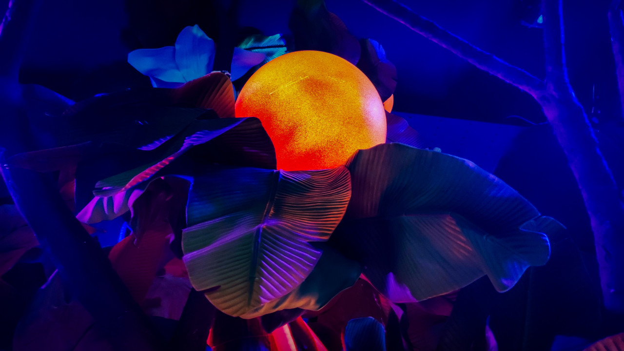 На изображении зафиксирован крупный декоративный плод, расположенный среди крупных искусственных листьев в тематической зоне выставки «Россия» на ВДНХ. Плод светится тёплым жёлто-оранжевым оттенком в окружении насыщенного синего света, подчёркивая контраст освещения в пространстве. Виден фрагмент ветвей, листьев и декоративных элементов, составляющих часть фантазийной инсталляции. Снимок может использоваться в материалах о выставочных решениях, художественных декорациях и оформлении тематических павильонов.