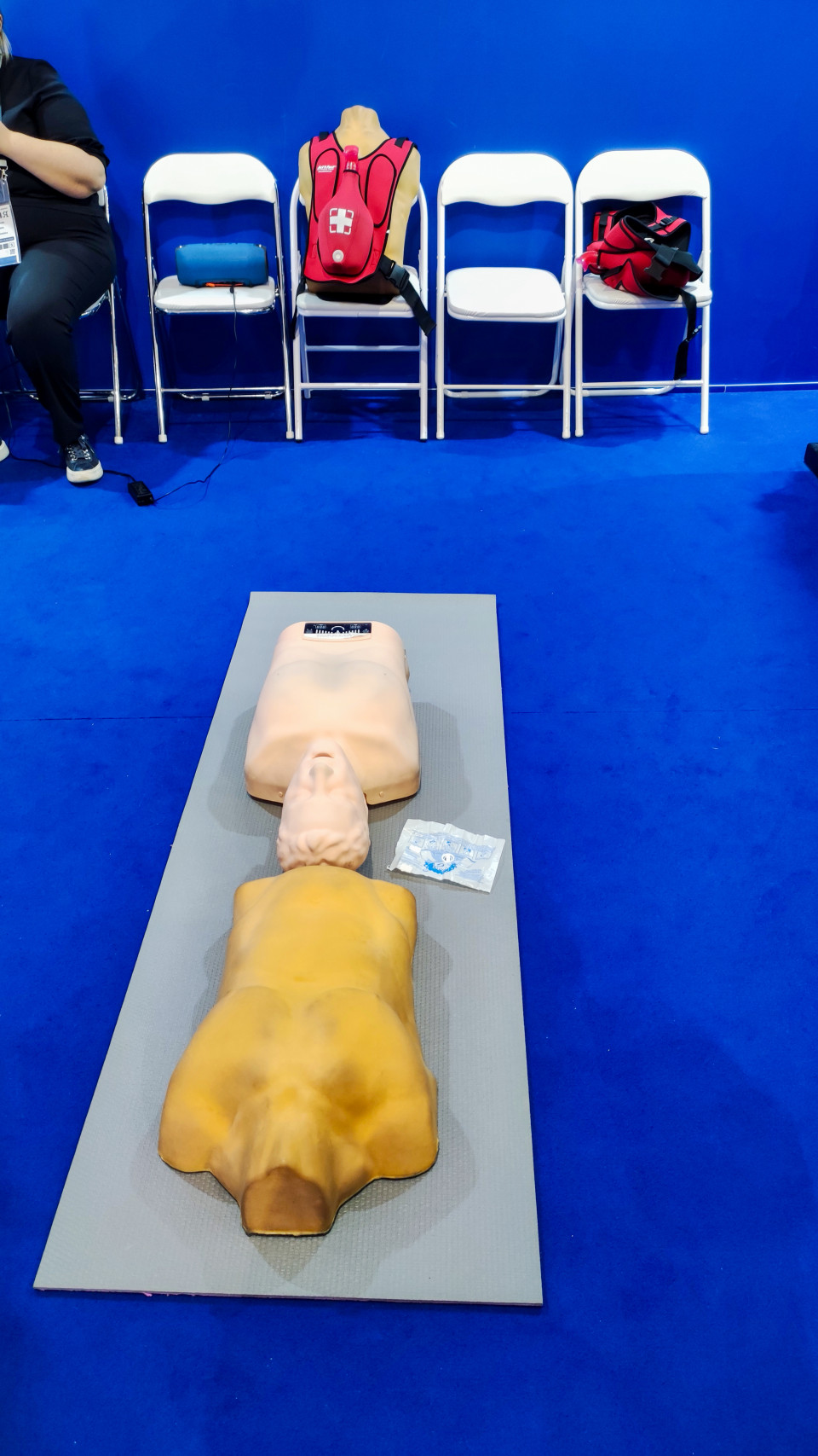 На фото изображены два манекена для практики сердечно-лёгочной реанимации, разложенные на коврике в зоне обучения первой помощи на экспозиции «На службе здоровья!» 2024 года на ВДНХ. На фоне стоят стулья, тренажёры и медицинские рюкзаки. Рядом размещён набор одноразовых средств для тренировки. Снимок подходит для материалов о технике СЛР, образовательных программах, подготовке волонтёров и инструкторов.