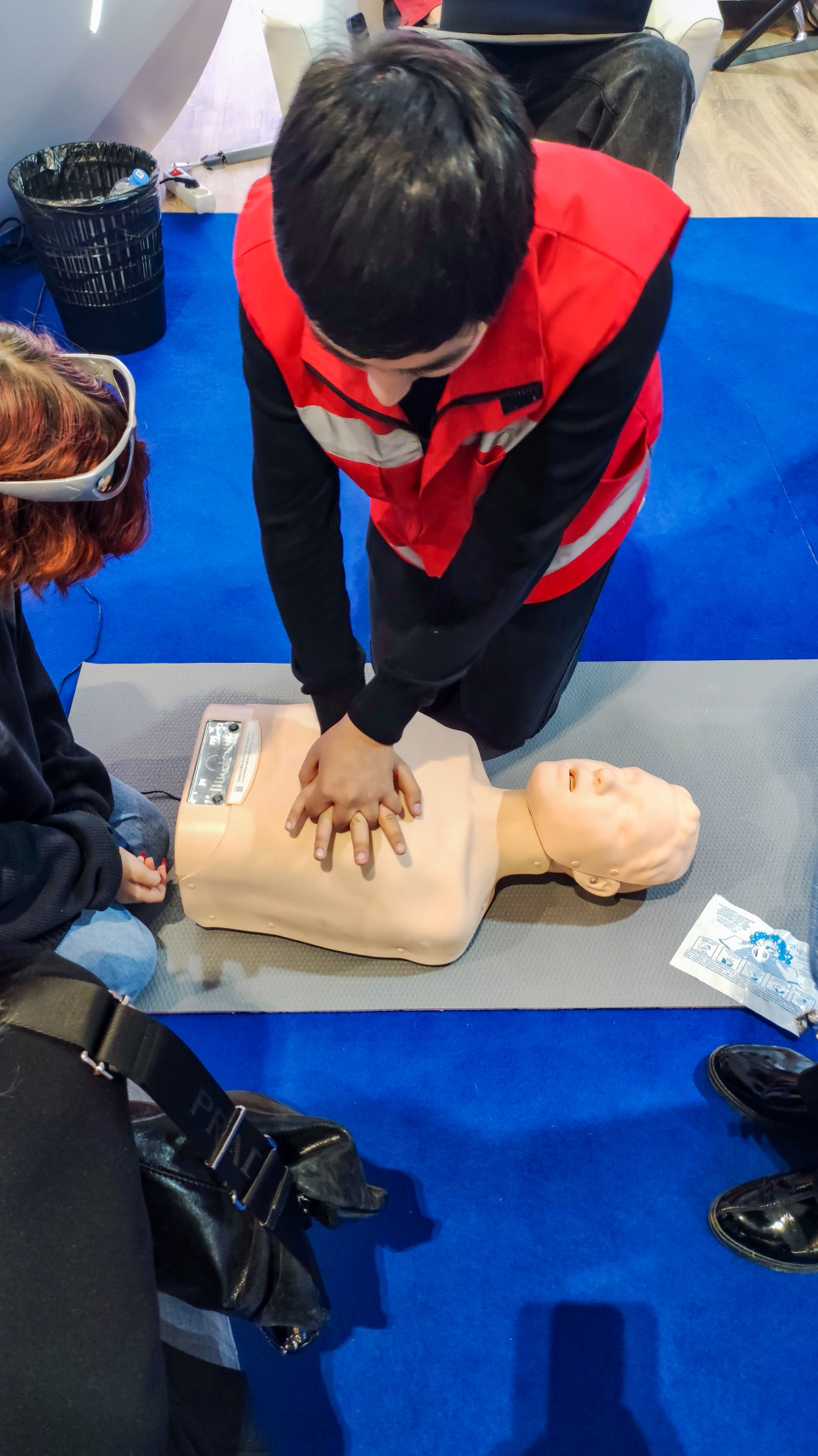 На снимке инструктор в красном жилете демонстрирует технику компрессий грудной клетки на учебном манекене в зоне обучения первой помощи экспозиции «На службе здоровья!» 2024 года на ВДНХ. Рядом наблюдают участники мастер-класса, а на полу размещён набор одноразовых средств для дыхательных манёвров. Фото можно использовать для материалов о подготовке к СЛР, образовательных программах и тренировках экстренных навыков.