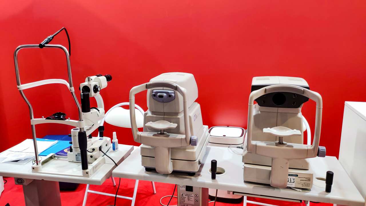 На фотографии представлены офтальмологические приборы, включая щелевую лампу и автоматические рефрактометры, размещённые на демонстрационном стенде экспозиции «На службе здоровья!» Министерства здравоохранения РФ на выставке-форуме «Россия» в 2024 году на ВДНХ. Красный фон стенда и стандартные медицинские столы указывают на выставочный формат. Снимок подходит для материалов о современных методах диагностики зрения, профессиональных медицинских форумах и презентации оборудования для офтальмологии.