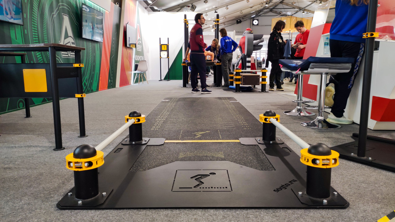 На фото показана интерактивная спортивная зона комплекса ГТО, установленная на международной выставке-форуме «Россия», проходившей на ВДНХ в Москве с ноября 2023 по июль 2024 года. В кадре видно измерительную платформу для тестирования физических нормативов, ограждения, элементы оборудования и посетителей стенда. Окружение включает брендированные панели и демонстрационные экраны, характерные для экспозиций крупных ведомств и госкорпораций. Снимок может использоваться в материалах о спортивных проектах, массовых тестированиях ГТО и мероприятиях ВДНХ.