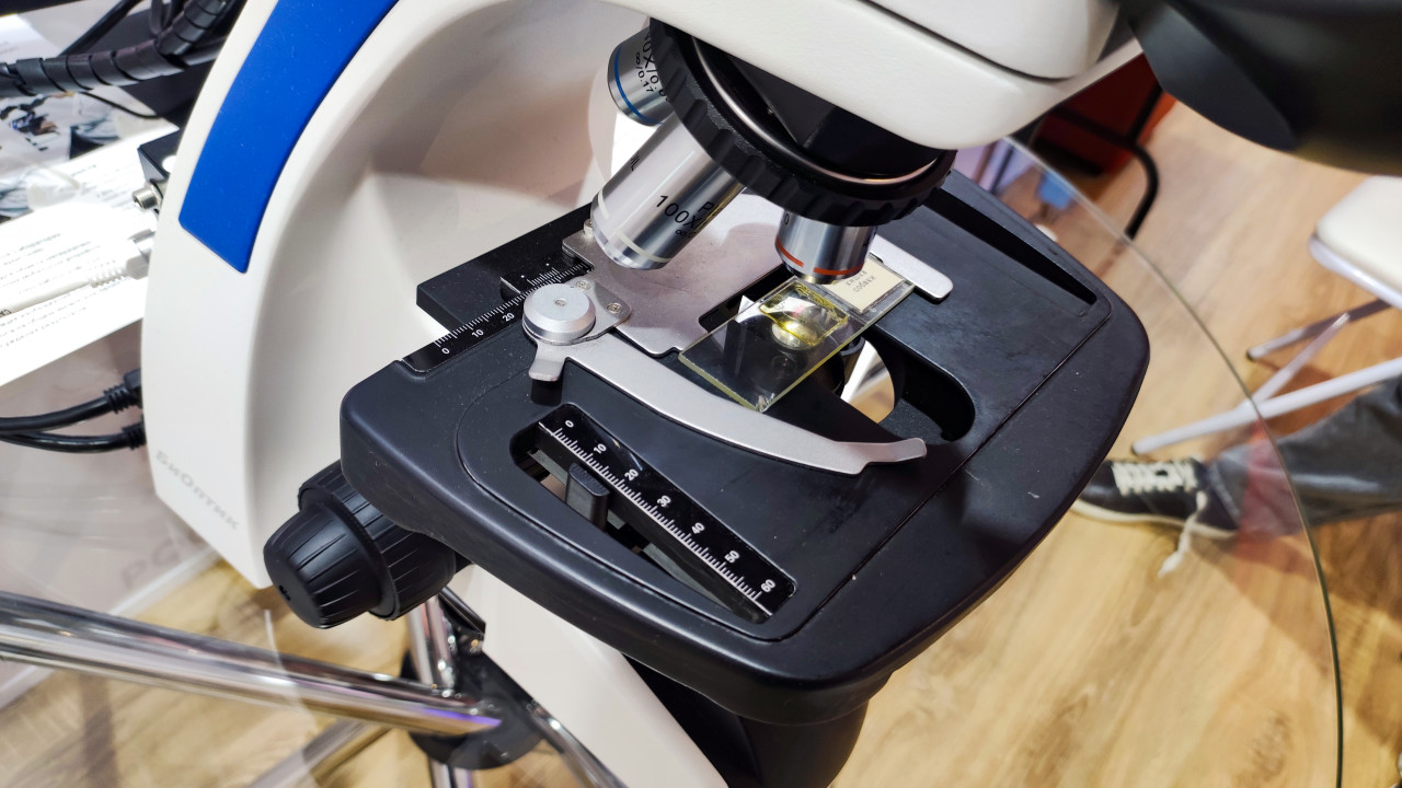 На снимке показан предметный столик оптического микроскопа с закреплённым стеклом-препаратом, снятый на выставочной площадке Минздрава России в 2024 году на ВДНХ. Видны объективы с разной степенью увеличения, механические координатные шкалы и элементы фиксации препарата. Поверхность стеклянного стола и детали окружения указывают на демонстрационное использование оборудования в рамках образовательных мероприятий. Фото подходит для иллюстрации научной деятельности, лабораторной диагностики, презентаций оборудования и обучающих материалов.