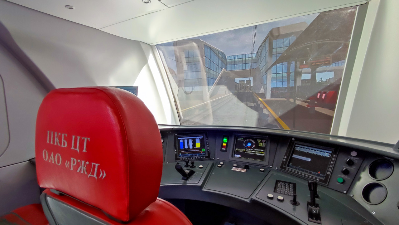 Кабина тренажёра ЭС2Г «Ласточка» с видом виртуальной платформы