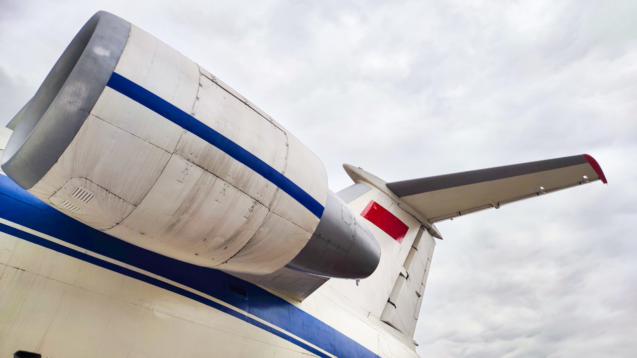 На снимке представлена задняя часть фюзеляжа пассажирского самолёта Як-42, выставленного на территории ВДНХ во время выставки-форума «Россия» (2023–2024). В кадре видны два двигателя, закреплённые по бокам хвостовой секции, элементы креплений, линии обшивки, а также часть киля с красным флагом. Пасмурное небо подчёркивает силуэт самолёта. Модель Як-42 была разработана ОКБ Яковлева в конце 1970-х годов и использовалась в гражданской авиации СССР и России. Фотография подходит для материалов о технике, истории авиации, выставочных экспонатах и инженерных разработках.