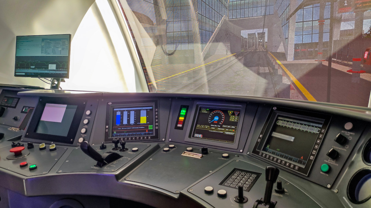Фотография фиксирует рабочее место машиниста в тренажёре электропоезда ЭС2Г «Ласточка», где отображается виртуальный железнодорожный путь, элементы контактной сети и окружающий пейзаж. На панели управления размещены мониторы с параметрами системы, сигнальные индикаторы, органы управления движением и цифровые блоки диагностики. Тренажёр является частью экспозиции в павильоне №15 ВДНХ, созданной для демонстрации транспортных технологий и обучения работе с современными электропоездами. Такой снимок может быть использован в материалах о цифровых симуляторах и подготовке железнодорожных специалистов.