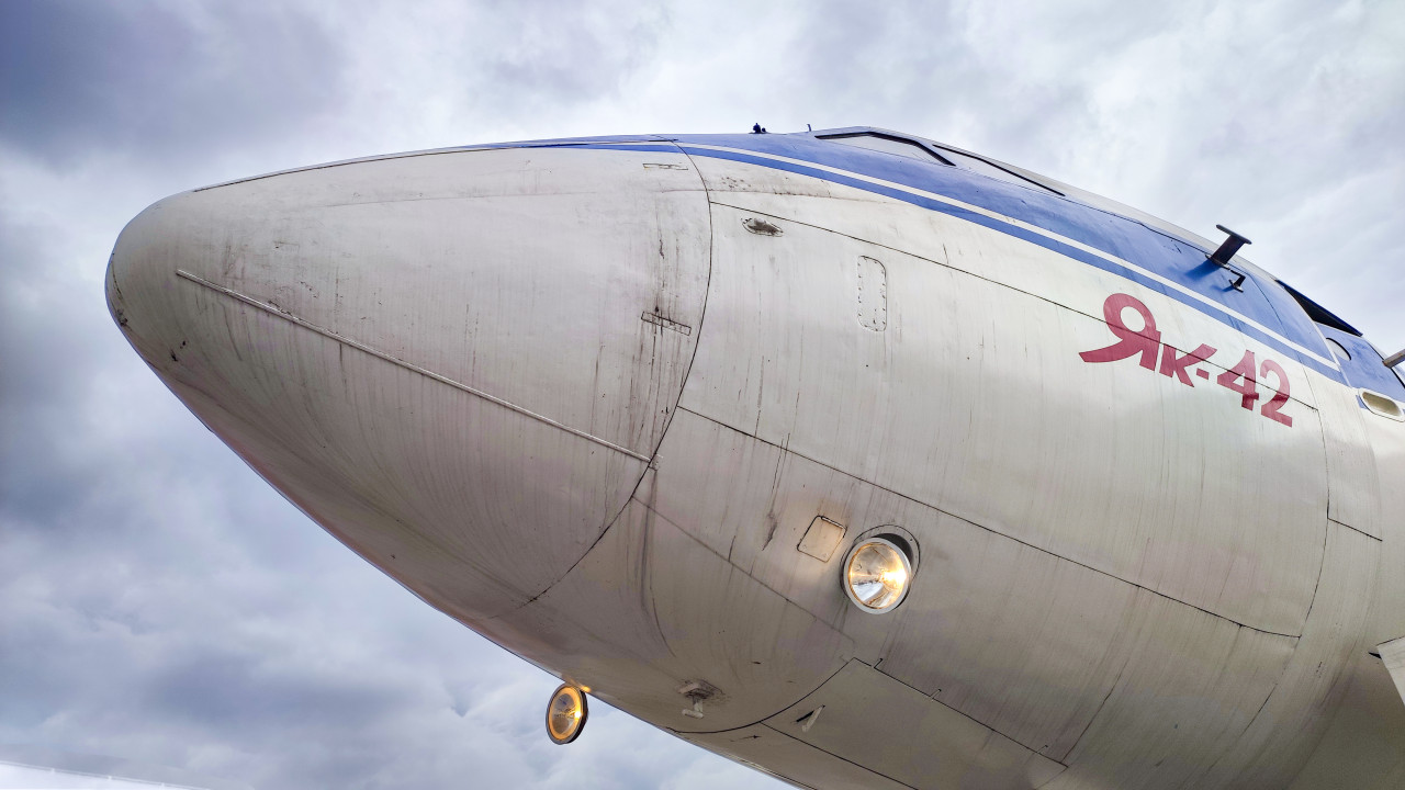 Фото показывает носовую часть пассажирского самолёта Як-42, представленного на территории ВДНХ во время выставки-форума «Россия» (2023–2024). На корпусе видны маркировка модели, характерные стыки обшивки, навигационные огни и передняя часть кабины пилотов. Объект установлен как открытый экспонат, что позволяет посетителям рассматривать конструкцию самолёта с близкого расстояния. На заднем плане — пасмурное небо и фрагменты временных сооружений выставки. Як-42 был разработан в ОКБ Яковлева в конце 1970-х годов и долгое время использовался в гражданской авиации СССР и России. Снимок предназначен для материалов об авиации, инженерных разработках и истории советских авиалайнеров.