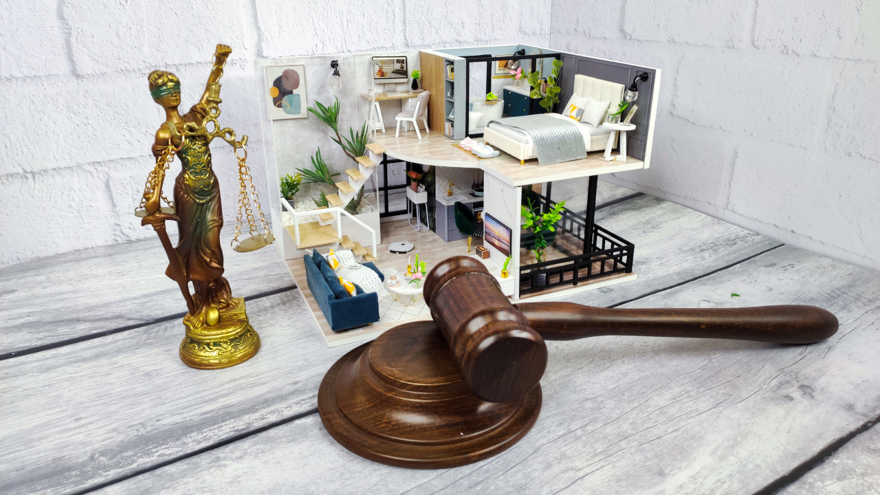 На фотографии изображена статуэтка Фемиды с мечом и весами, расположенная слева на деревянной поверхности, а на фоне виден детализированный двухэтажный макет современного жилья с мебелью, лестницей, растениями и зоной гостиной. На переднем плане размещён деревянный судейский молоток с основанием. Фоном служит светлая кирпичная стена. Композиция объединяет тему правосудия и жилищных вопросов, что позволяет использовать снимок в публикациях о судебных спорах, недвижимости, дизайне интерьера и правовых аспектах владения жильём.