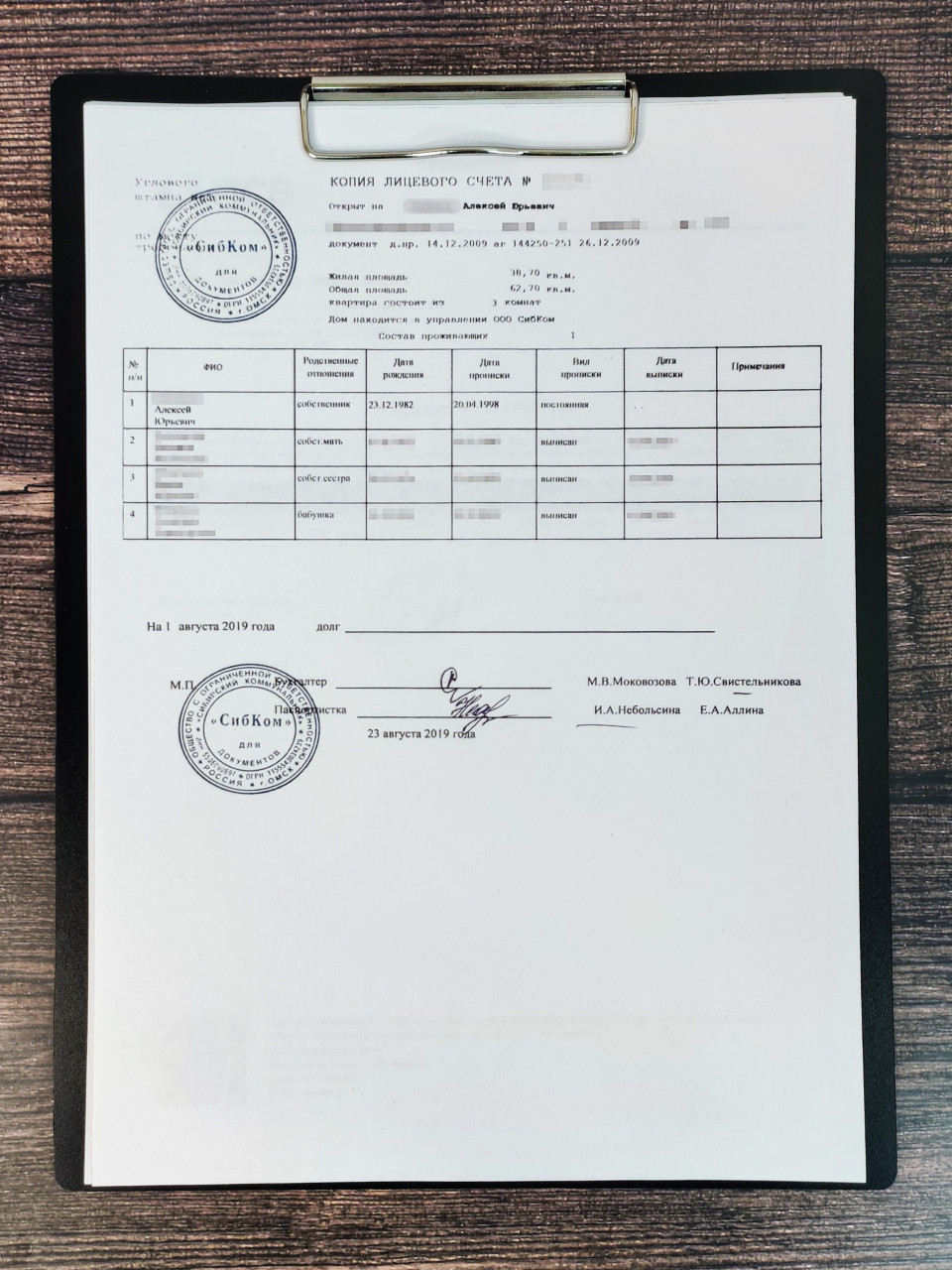 На изображении показан официальный документ — копия лицевого счёта, закрепленная на планшете для бумаг. В таблице указаны фамилии жильцов, даты рождения, даты регистрации и состав семьи. На документе видны круглые печати и подписи сотрудников управляющей организации. Фон выполнен в виде деревянной поверхности с выраженной текстурой. Снимок иллюстрирует оформление жилищных документов, связанных с регистрацией граждан по месту жительства.