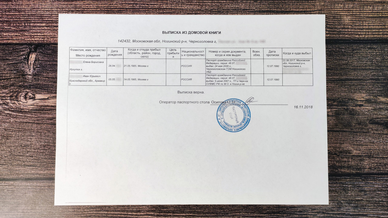 На снимке представлена выписка из домовой книги, расположенная на деревянной поверхности светлого тона. Документ содержит таблицу с информацией о фамилиях, датах рождения, данных паспортов, национальности, датах регистрации и выбытия. В правой части видна круглая печать и подпись оператора паспортного стола, а внизу отмечена дата оформления. Снимок отражает выдачу официальной справки, используемой в жилищных и юридических вопросах.