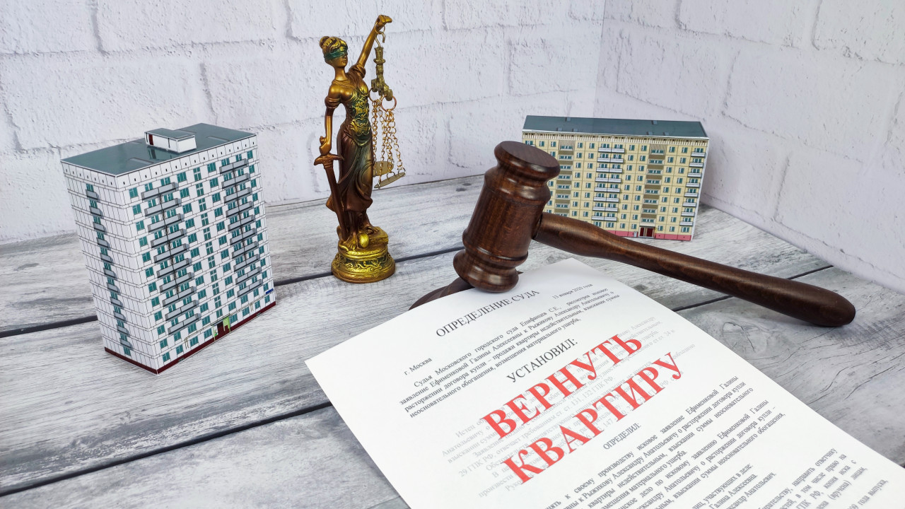 На снимке размещены два макета многоквартирных домов, статуэтка Фемиды с весами правосудия и деревянный молоток судьи, лежащий на листе с крупной надписью «Вернуть квартиру». Фоном служит светлая кирпичная стена и деревянная поверхность стола. Композиция символизирует судебный процесс, защиту прав собственности и разбирательства по спорам о недвижимости. Фото подходит для юридических публикаций, статей о спорах жильцов, судебных решениях и правовых механизмах возврата имущества.