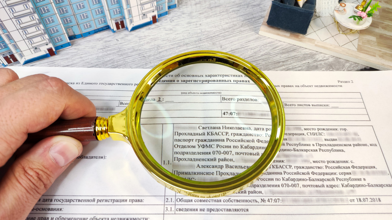 На изображении видна рука человека, удерживающая увеличительную лупу над листом выписки из ЕГРН. Через стекло хорошо читается часть текста, включая строки о собственниках. На заднем плане расположен макет многоэтажного жилого здания, а справа видна миниатюрная модель интерьера комнаты. Снимок выполнен в помещении при ровном освещении. Он отражает процесс внимательной проверки документов, анализа прав собственности и изучения данных о недвижимости. Используется для материалов о юридической экспертизе, проверке чистоты сделки, кадастровых сведениях и работе с документацией.