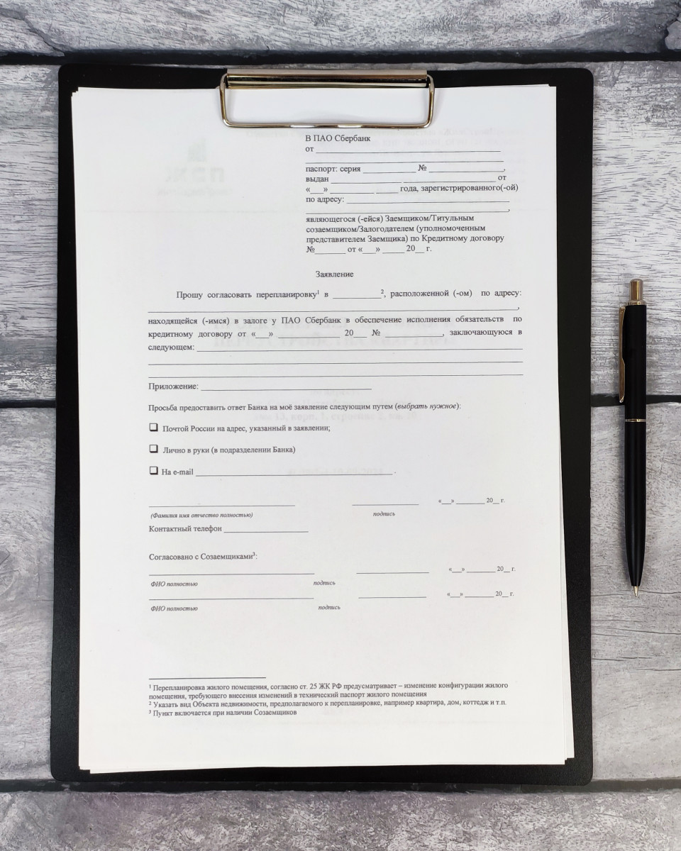 На фото показан бланк заявления, размещённый на чёрном планшете с металлическим зажимом. Документ адресован ПАО Сбербанк и содержит поля для данных заявителя, информации о залоговой недвижимости и способах получения ответа. Рядом расположен чёрный шариковый стильный ручка с золотистыми элементами. Фоном служит серое деревянное покрытие. Снимок может быть использован для материалов о согласовании перепланировок, ипотечных обязательствах, взаимодействии с банками и юридических процедурах.