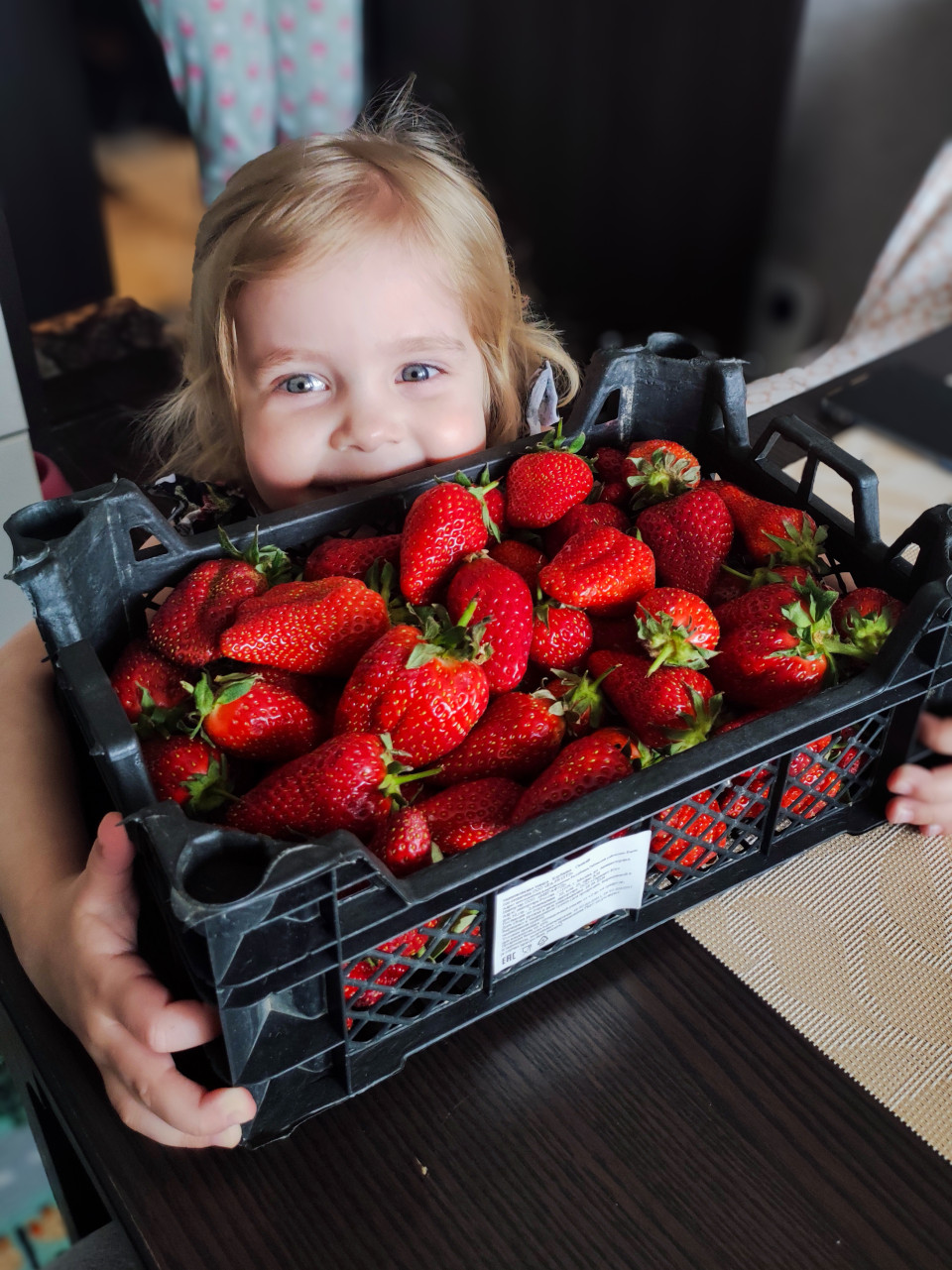На фотографии изображен маленький ребенок, держащий пластиковый ящик, полностью заполненный крупной спелой клубникой. Ящик стоит на столе в домашней обстановке, а за ним виднеется часть интерьера. На переднем плане хорошо различима текстура клубники и формы ягод. Ребенок находится вплотную к ящику, что подчеркивает масштаб наполнения. Кадр можно использовать в материалах о сборах урожая, домашних заготовках, семейных занятиях, сезонных продуктах и визуальных проектах о пищевых ингредиентах.