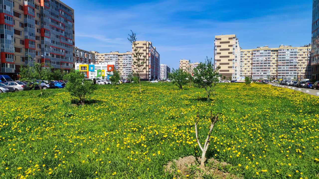 На фото представлен просторный газон, полностью покрытый одуванчиками. Между ними растут молодые деревья. По бокам расположены современные многоэтажные дома с яркими фасадными вставками и застеклёнными балконами. На заднем плане видны корпуса типовой застройки, формирующие плотный жилой массив. Сцена отражает весенний городской ландшафт и может использоваться в публикациях о природе в городской среде, озеленении и благоустройстве.