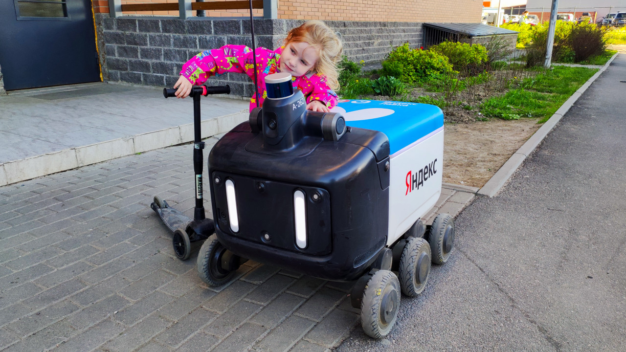 Девочка осматривает робота-курьера Яндекс у жилого дома