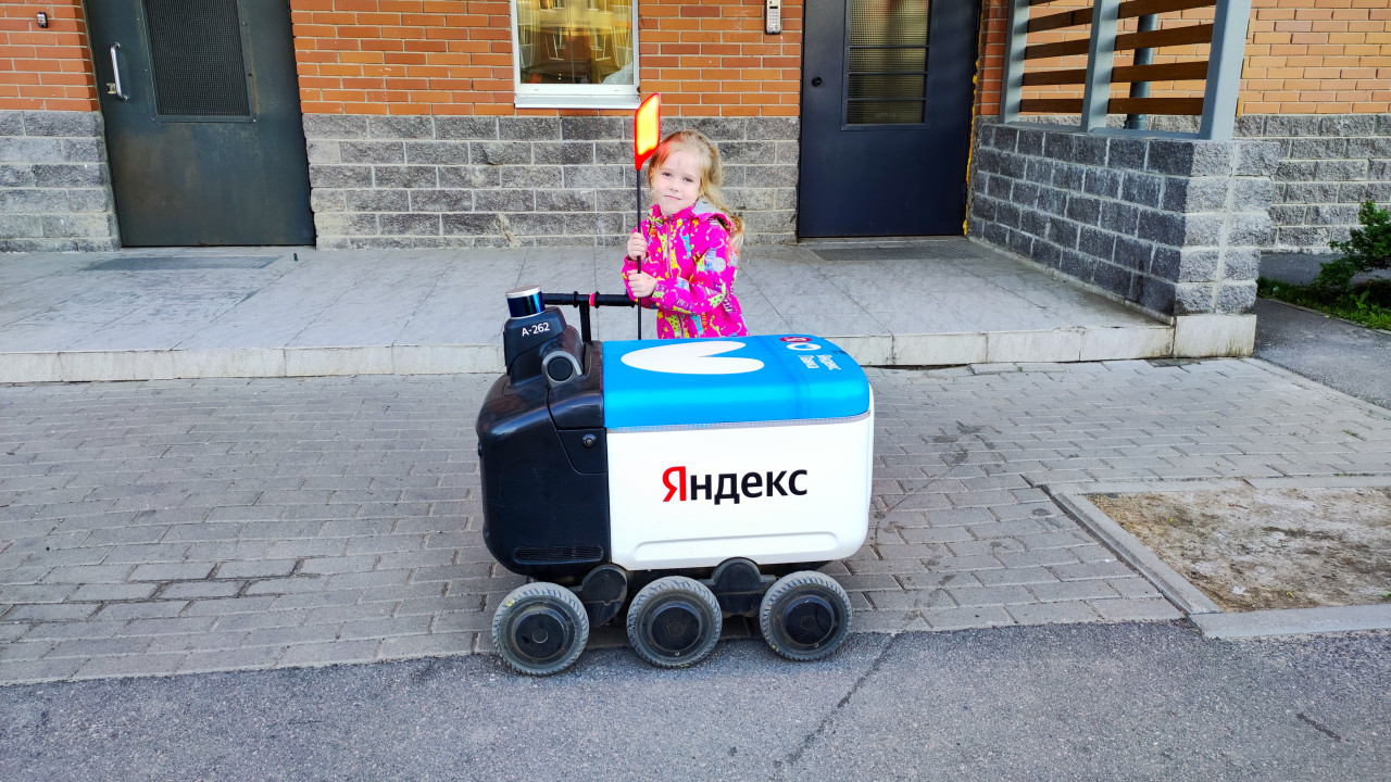 Девочка рядом с роботом-доставщиком Яндекс во дворе дома