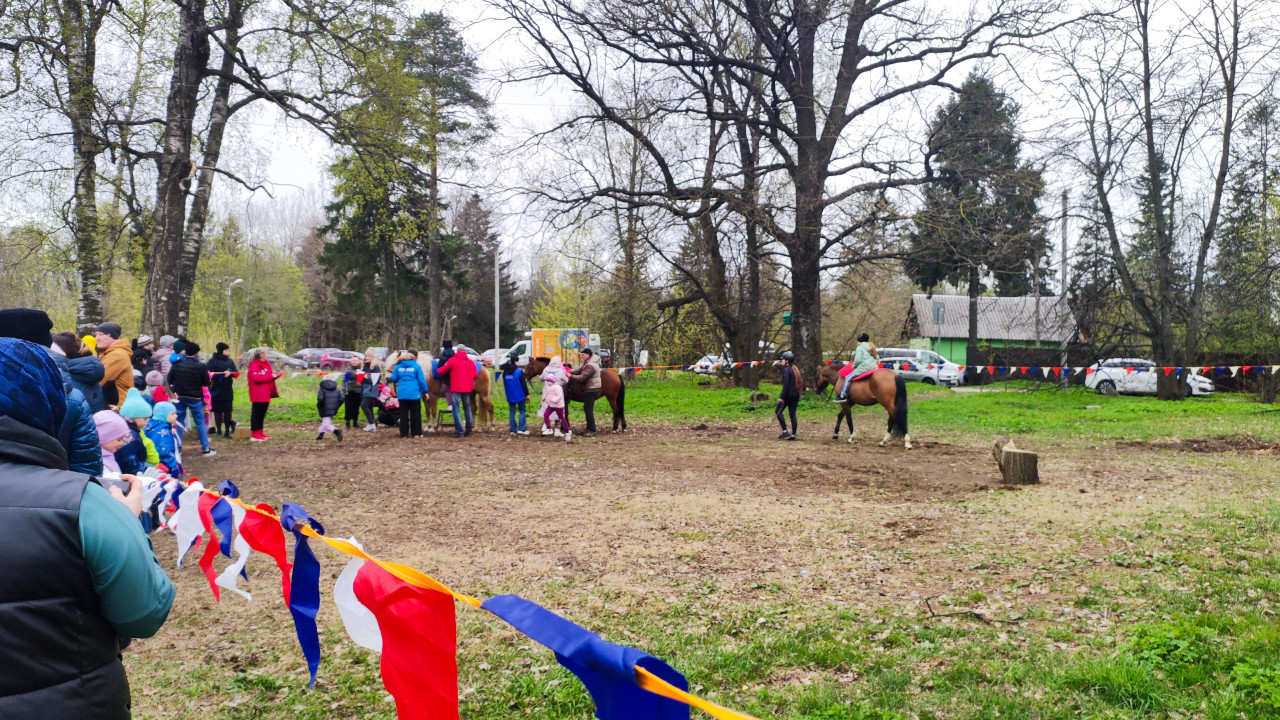 На снимке изображена открытая площадка в парковой зоне, где проводится катание детей на лошадях. Видны несколько лошадей с поводырями, стоящие среди группы взрослых и детей. В левой части присутствует ограждение из цветных ленточек, отделяющее зону наблюдения. На заднем плане находятся деревья, машины и небольшие постройки. Освещение дневное, небо затянуто облаками. Кадр подходит для материалов о мероприятиях на свежем воздухе, семейном отдыхе, работе с животными и развитии городской рекреационной инфраструктуры.