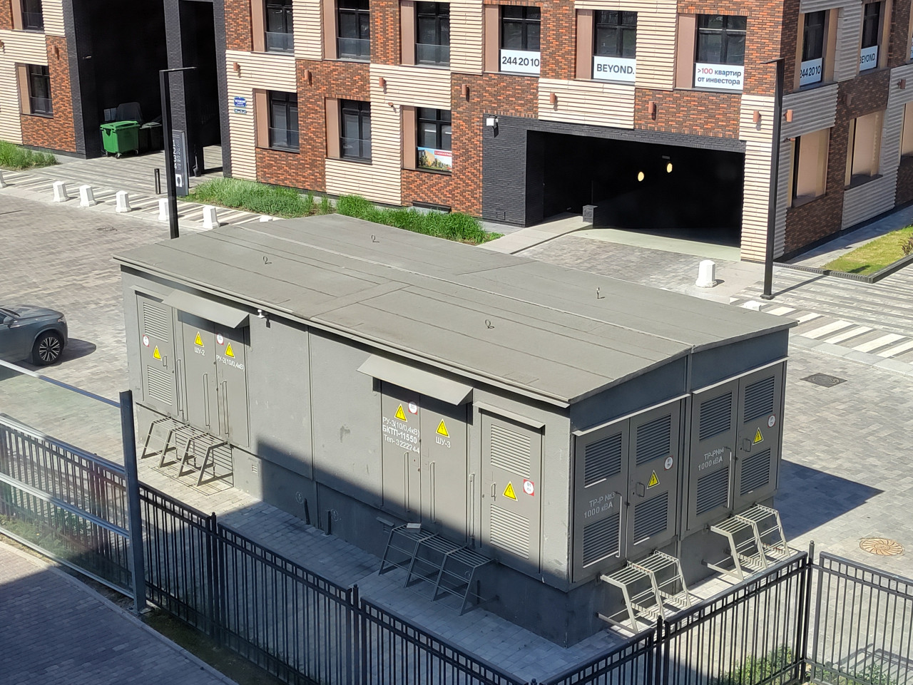 На снимке показана наземная трансформаторная подстанция серого цвета, размещенная на мощеной площадке во дворе современного жилого комплекса. Постройка оборудована металлическими дверями с вентиляционными решетками и предупреждающими знаками высокого напряжения. Вокруг сооружения установлено ограждение, рядом видны элементы благоустройства квартала, уличное освещение и парковочные места. Фотография может использоваться в материалах о городской инфраструктуре, инженерных сетях и планировке жилых районов.