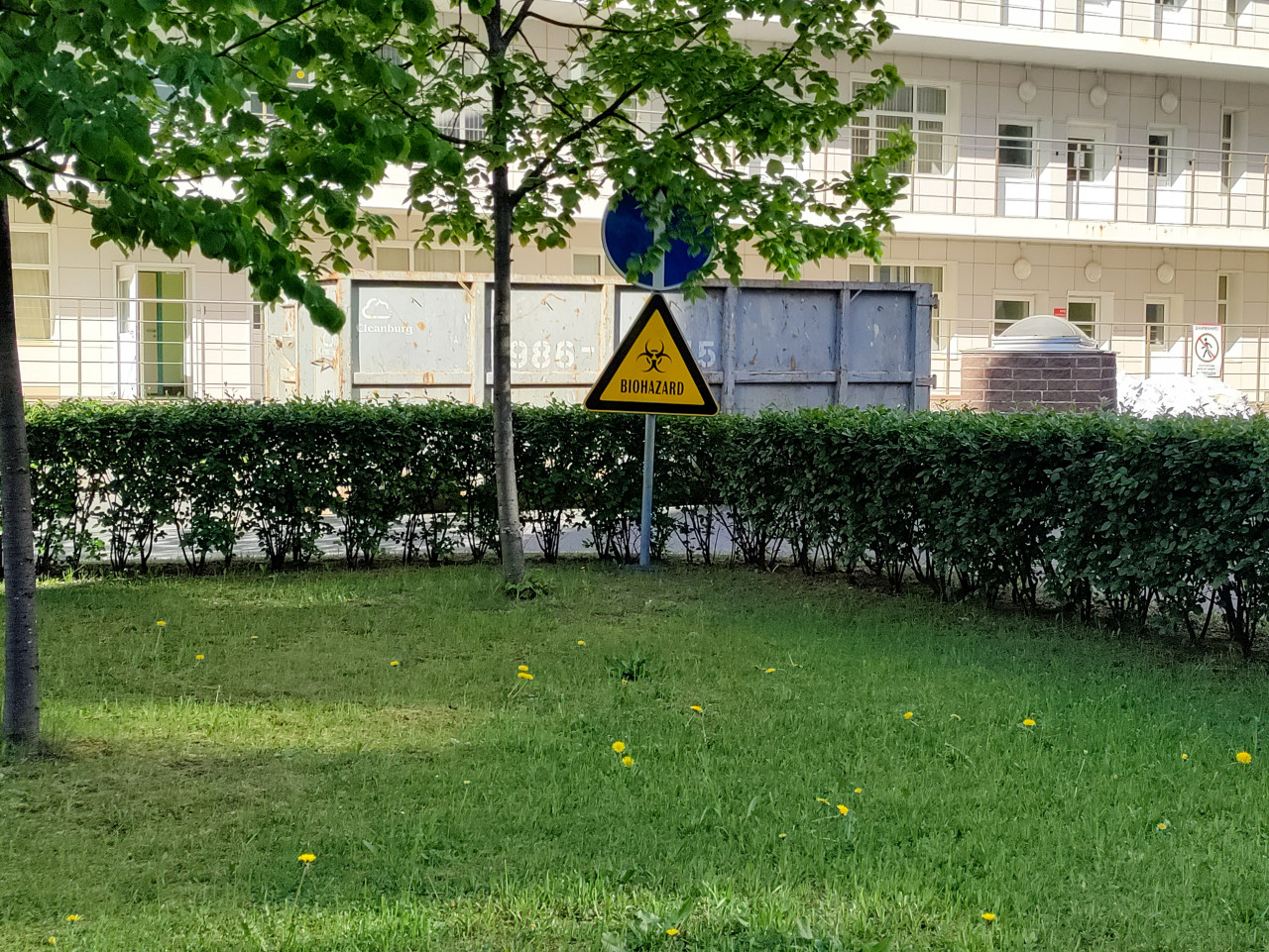Знак «BIOHAZARD» на газоне возле зданий больницы Боткина