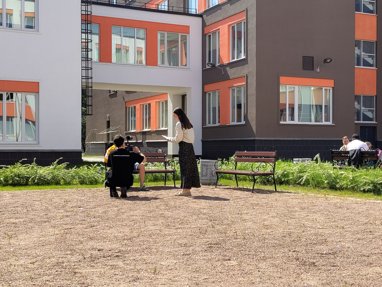 На фото изображён оператор, снимающий человека, сидящего на скамейке во дворе школы. Рядом находится женщина, держащая бумаги и участвующая в организации сцены. В кадр попадают фасады школьных корпусов с белыми и тёмно-серыми стенами и оранжевыми оконными вставками, характерными для современной школьной архитектуры. На заднем плане видны люди, сидящие в зоне отдыха. На переднем плане — гравийное покрытие двора, окружённое кустарниками и газоном. Снимок отражает рабочий момент подготовки видеоматериала в образовательном учреждении.
